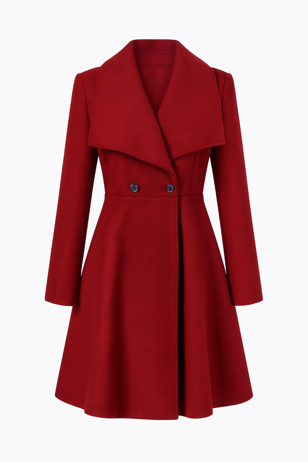 Podkreśl swoją elegancję w chłodniejsze dni dzięki temu stylowemu, czerwonymu płaszczowi damskiemu. Taliowany krój pięknie modeluje sylwetkę, a szeroki kołnierz dodaje całości wyrafinowanego charakteru. Dwurzędowe zapięcie z ozdobnymi guzikami zapewnia zarówno funkcjonalność, jak i modny wygląd.