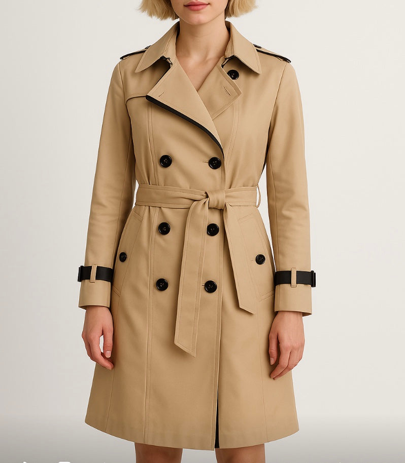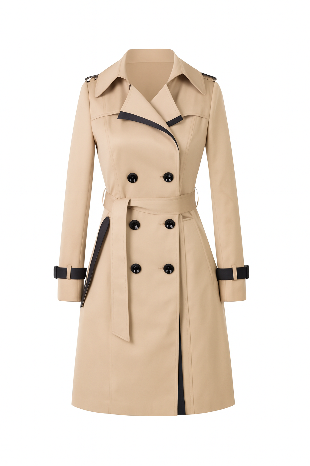 Szukasz okrycia wierzchniego, które łączy w sobie szyk i wygodę? Ten krótki trencz o dwurzędowym kroju to połączenie ponadczasowej elegancji i praktycznego designu. Pasek w talii podkreśla sylwetkę, a dopasowany krój sprawia, że płaszcz świetnie komponuje się z codziennymi i półformalnymi stylizacjami. Klasyczne klapy i kontrastowe wykończenia dodają mu wyrazistego charakteru.